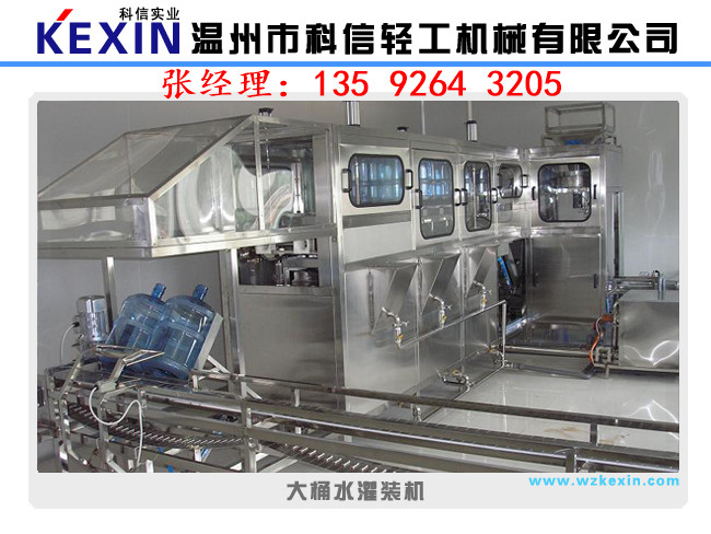 溫州科信輕工機械有限公司專業生產該生產線是供3-5加侖桶裝飲用水生產之用,型號有100型.200型.300型.450型.600型.900型和1200型。該系列桶裝生產線由洗瓶.灌裝和封口三部分組成。洗瓶機采用多道洗滌液噴射和消毒液噴射,達到洗滌.消毒的目的,消毒液可以循環使用。封口機可以自動封口,輸送瓶蓋過程口配有衛淋裝置,以確保瓶蓋無菌清潔。該系列生產線均可自動洗滌.消毒灌裝.計數和輸出。具有功能齊全.設計新穎.自動化程度高等特點,是集機.電.氣于一體的新型飲用水桶裝設備。